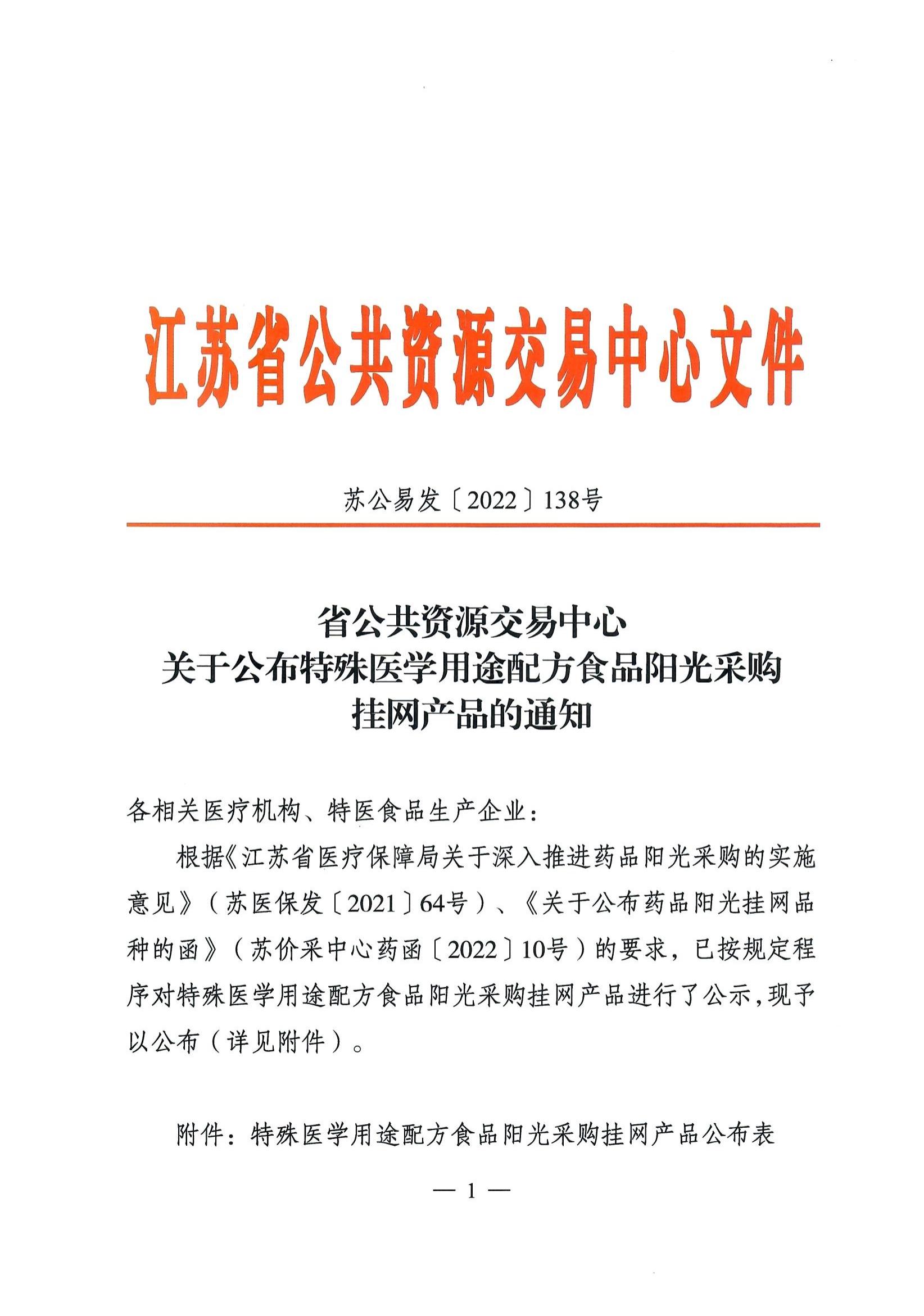 【江苏】省公共资源交易中心关于公布特殊医学用途配方食品阳光采购挂网产品的通知