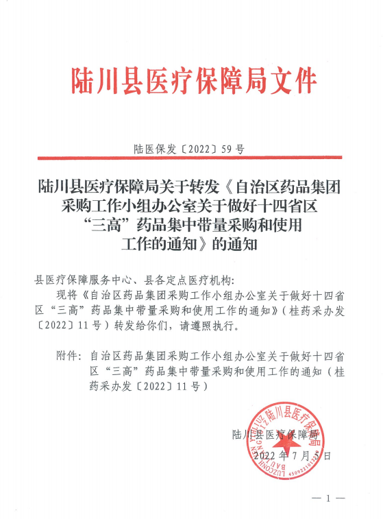 【广西】广西壮族自治区玉林市陆医保发〔2022〕59号陆川县医疗保障局关于转发《自治区药品集团采购工作小组办公室关于做好十四省区“三高”药品集中带量采购和使用工作的通知》的通知