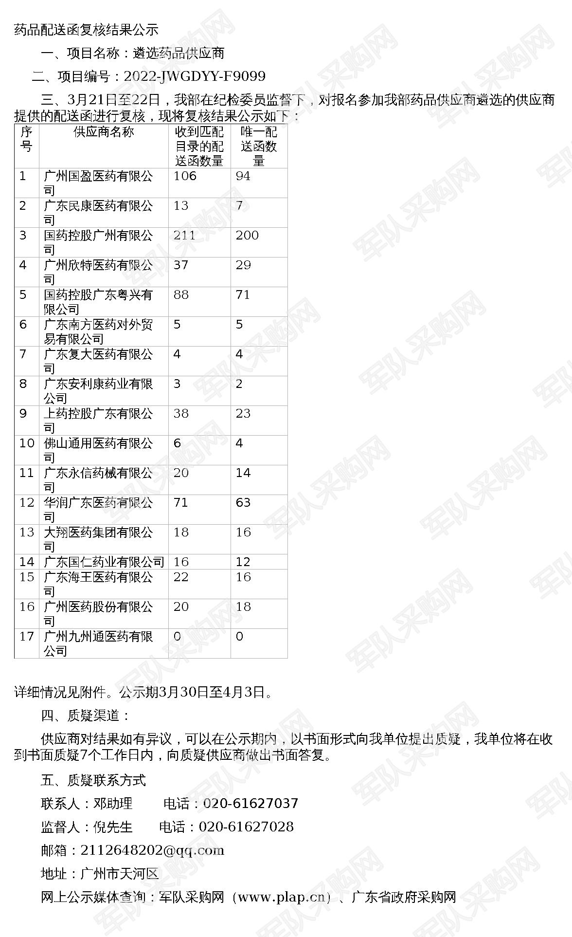 【军队采购】军队采购网药品配送函复核结果公示2022-JWGDYY-F9099