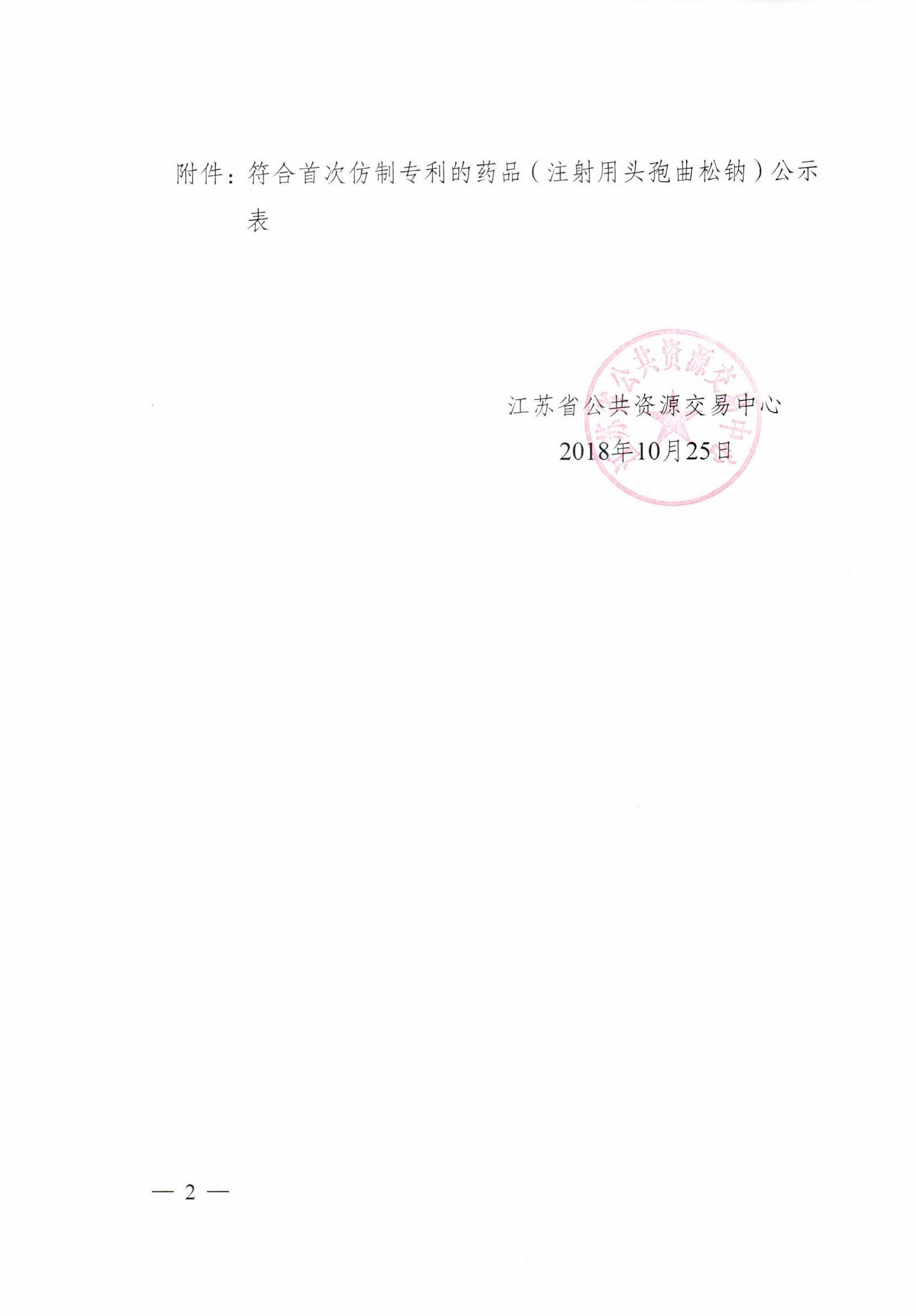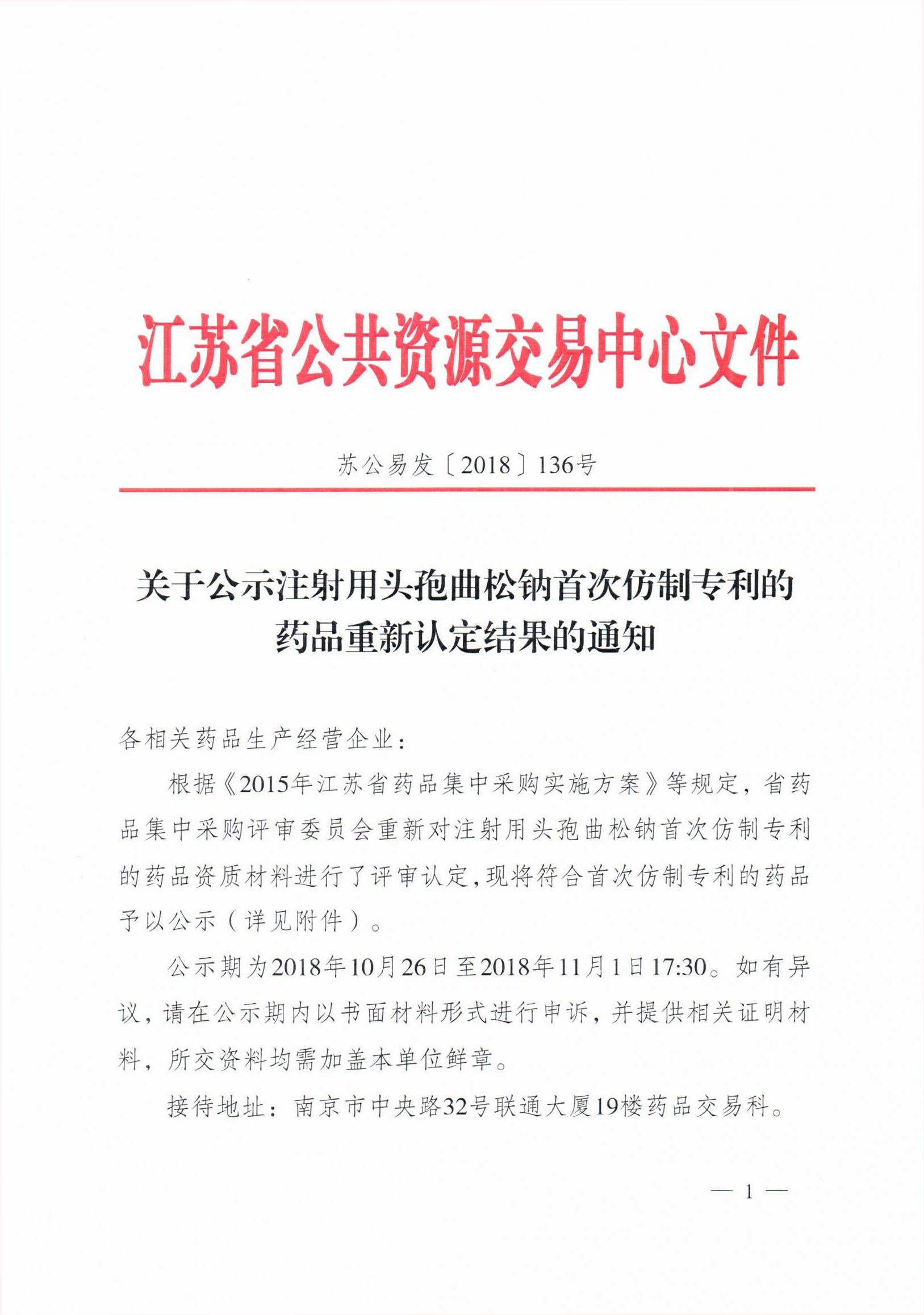 【江苏】关于公示注射用头孢曲松钠首次仿制专利的药品重新认定结果的通知