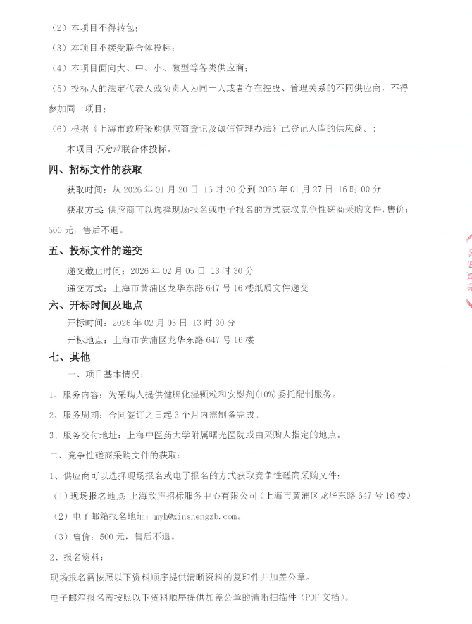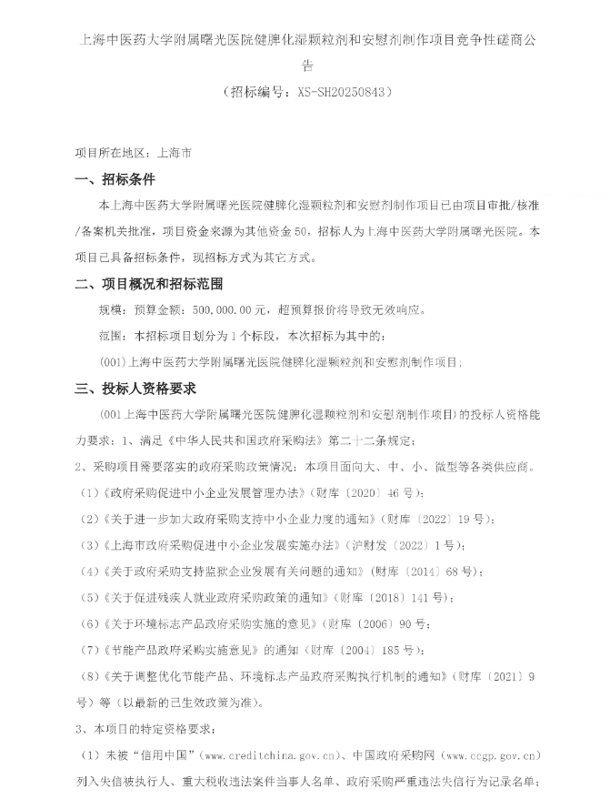 【上海中医药大学附属曙光医院】上海中医药大学附属曙光医院健脾化湿颗粒剂和安慰剂制作项目竞争性磋商公告