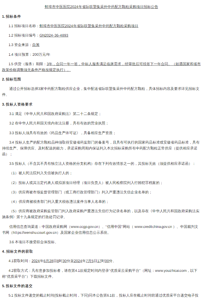 【蚌埠市中医医院】安徽省蚌埠市中医医院2024年省际联盟集采外中药配方颗粒采购项目招标公告