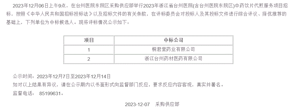 【台州医院】2023年浙江省台州医院中药饮片代煎服务项目预中标公示