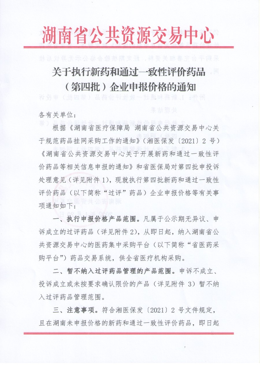 【湖南】湖南省关于执行新药和通过一致性评价药品(第四批)企业申报价格的通知