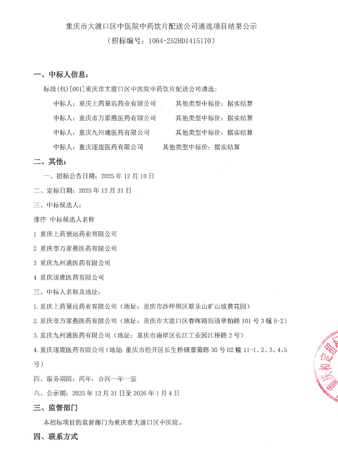 【重庆市大渡口区中医院】重庆市大渡口区中医院中药饮片配送公司遴选项目结果公示