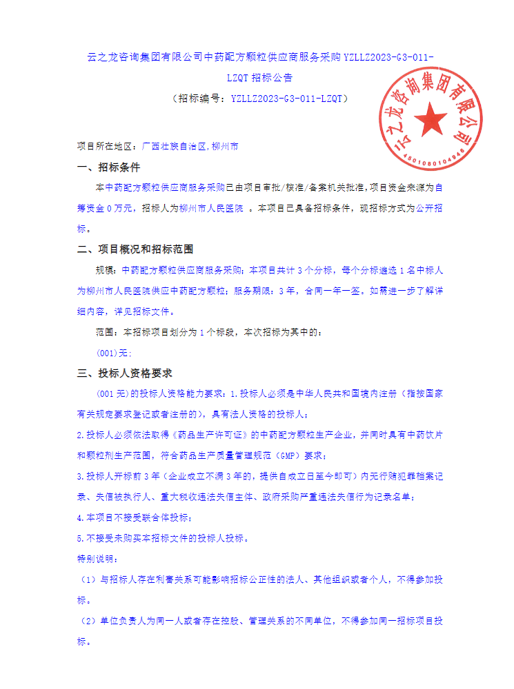 【柳州市人民医院】广西壮族自治区柳州市云之龙咨询集团有限公司中药配方颗粒供应商服务采购YZLLZ2023-G3-011-LZQT招标公告