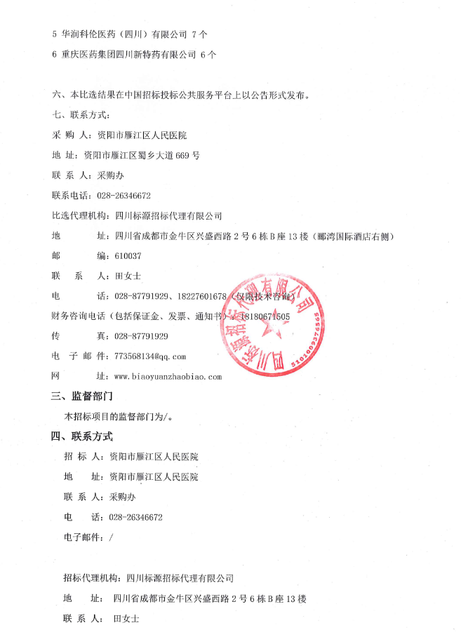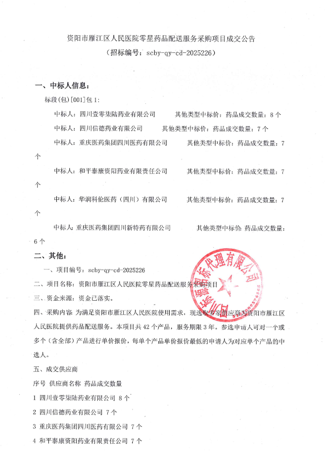 【资阳市雁江区人民医院】四川省资阳市雁江区人民医院零星药品配送服务采购项目成交公告