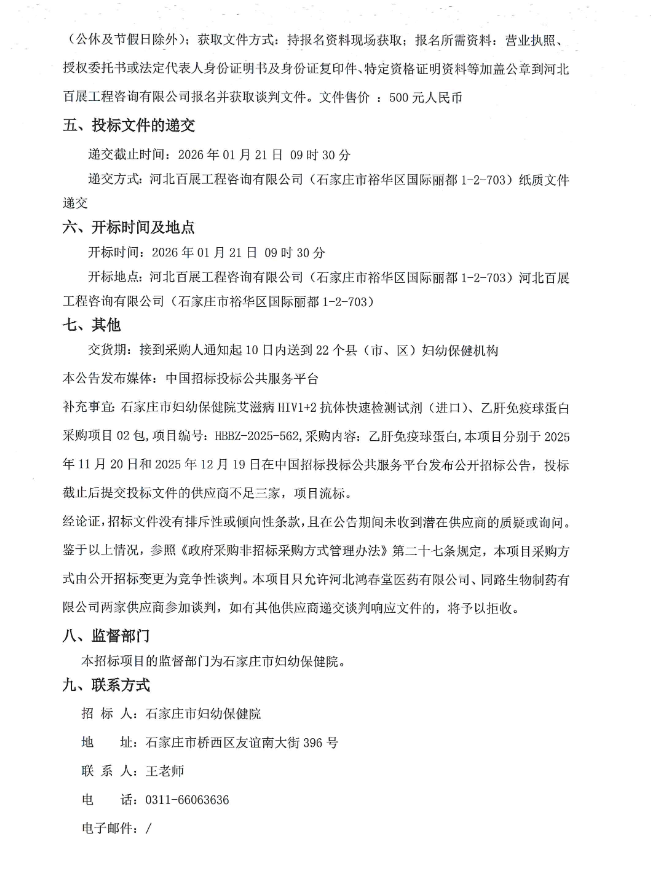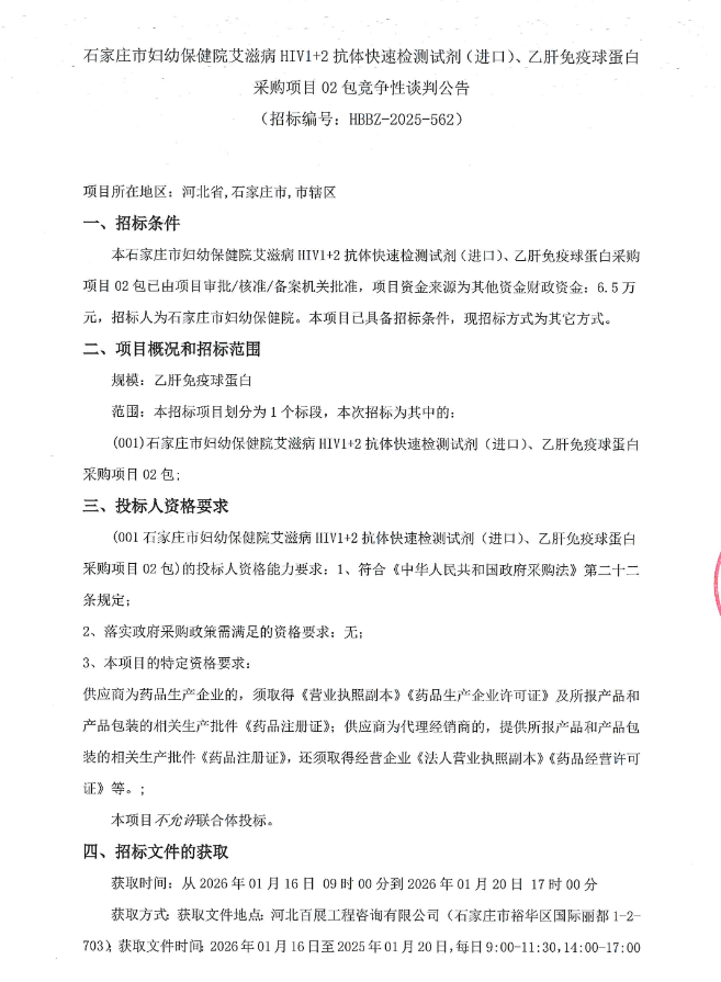 【石家庄市妇幼保健院】河北省石家庄市妇幼保健院艾滋病HIV1+2抗体快速检测试剂(进口)、乙肝免疫球蛋白采购项目02包竞争性谈判公告