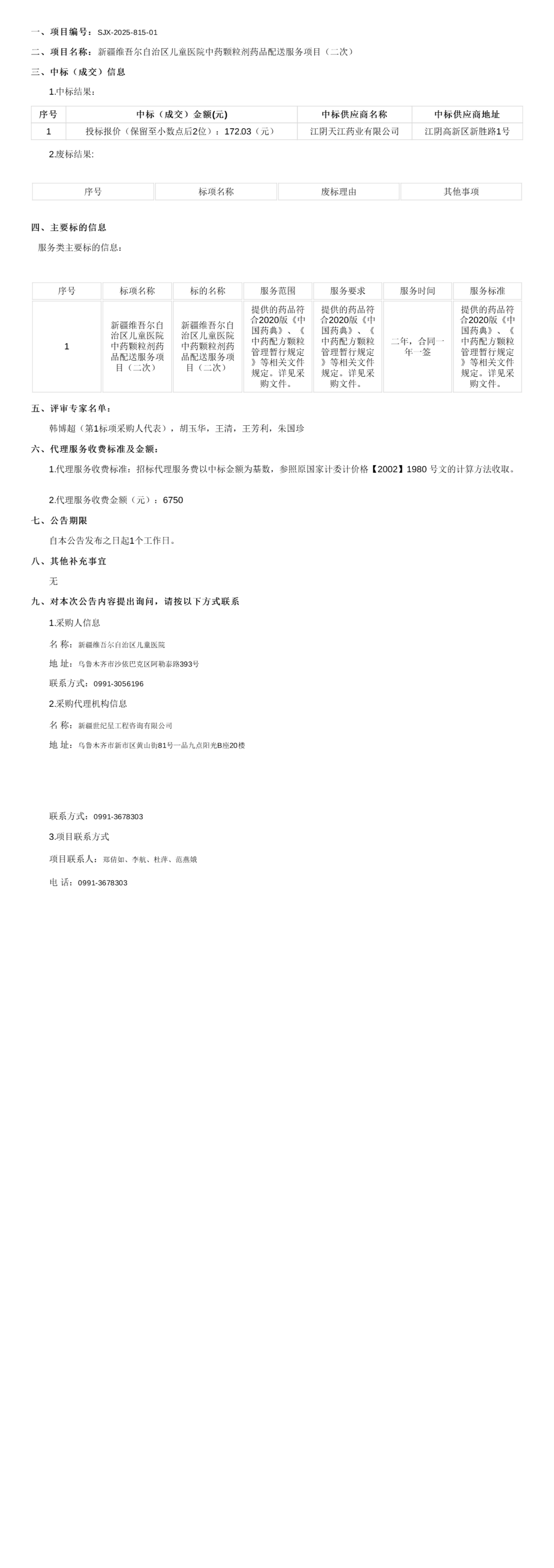 【新疆维吾尔自治区儿童医院】新疆维吾尔自治区儿童医院中药颗粒剂药品配送服务项目(二次)中标(成交)结果公告