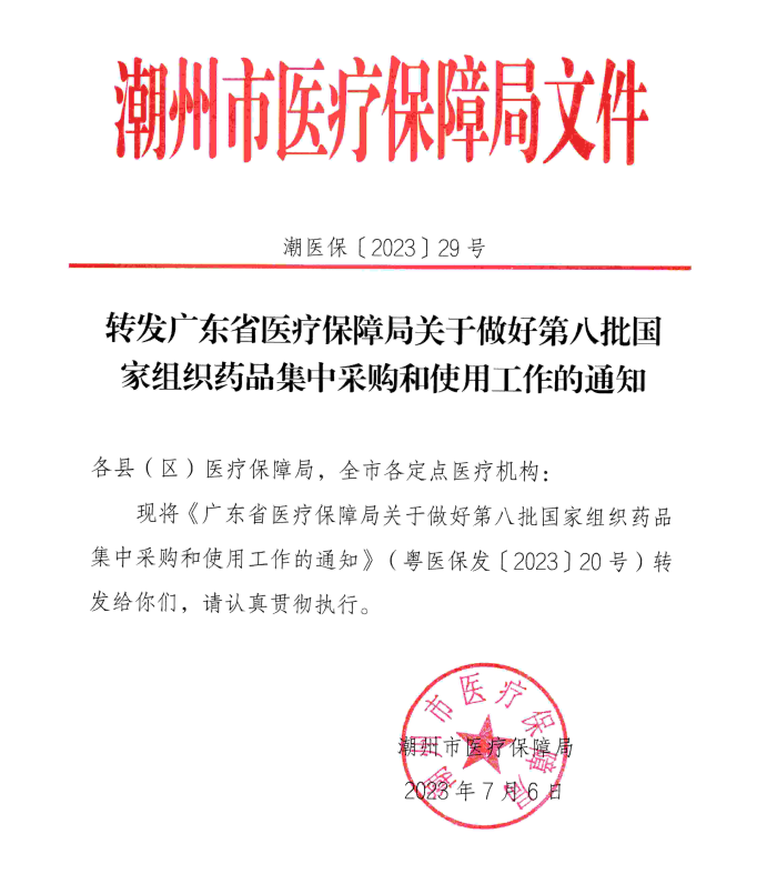 【潮州】潮医保〔2023〕29号转发广东省医疗保障局关于做好第八批国家组织药品集中采购和使用工作的通知
