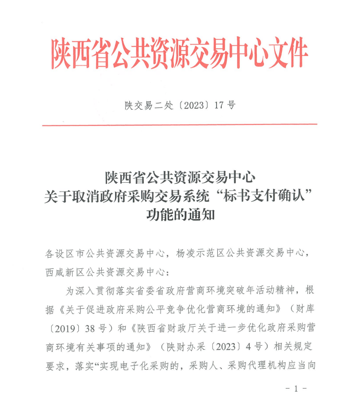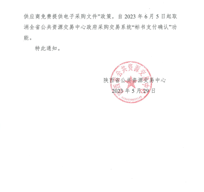 为深入贯彻落实省委省政府营商环境突破年活动精神,根据《关于促进政府采购公平竞争优化营商环境的通知》(财库〔2019〕38号)和《陕西省财政厅关于进一步优化政府采购营商环境有关事项的通知》(陕财办采〔2023〕4号)相关规定要求,落实“实现电子化采购的,采购人、采购代理机构应当向供应商免费提供电子采购文件"政策,自2023年6月5日起取消全省公共资源交易中心政府采购交易系统“标书支付确认”功能。