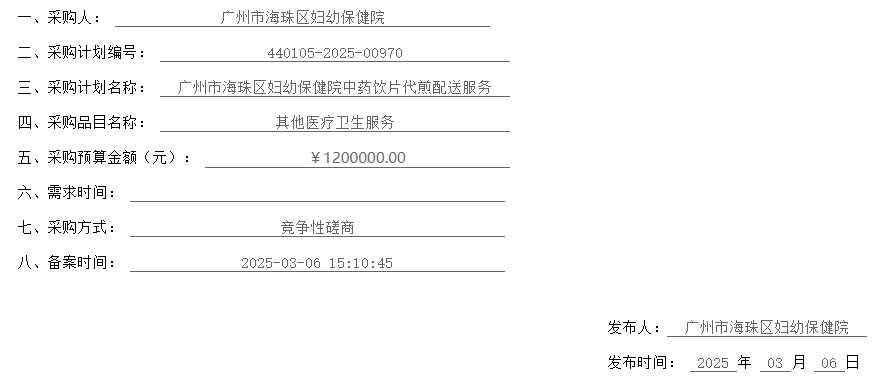 【广州市海珠区妇幼保健院】广东省广州市海珠区妇幼保健院中药饮片代煎配送服务(20250306)