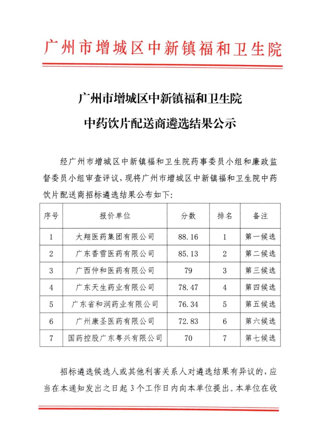 【广州市增城区中新镇福和卫生院】广东省广州市增城区中新镇福和卫生院中药饮片配送商遴选结果公示