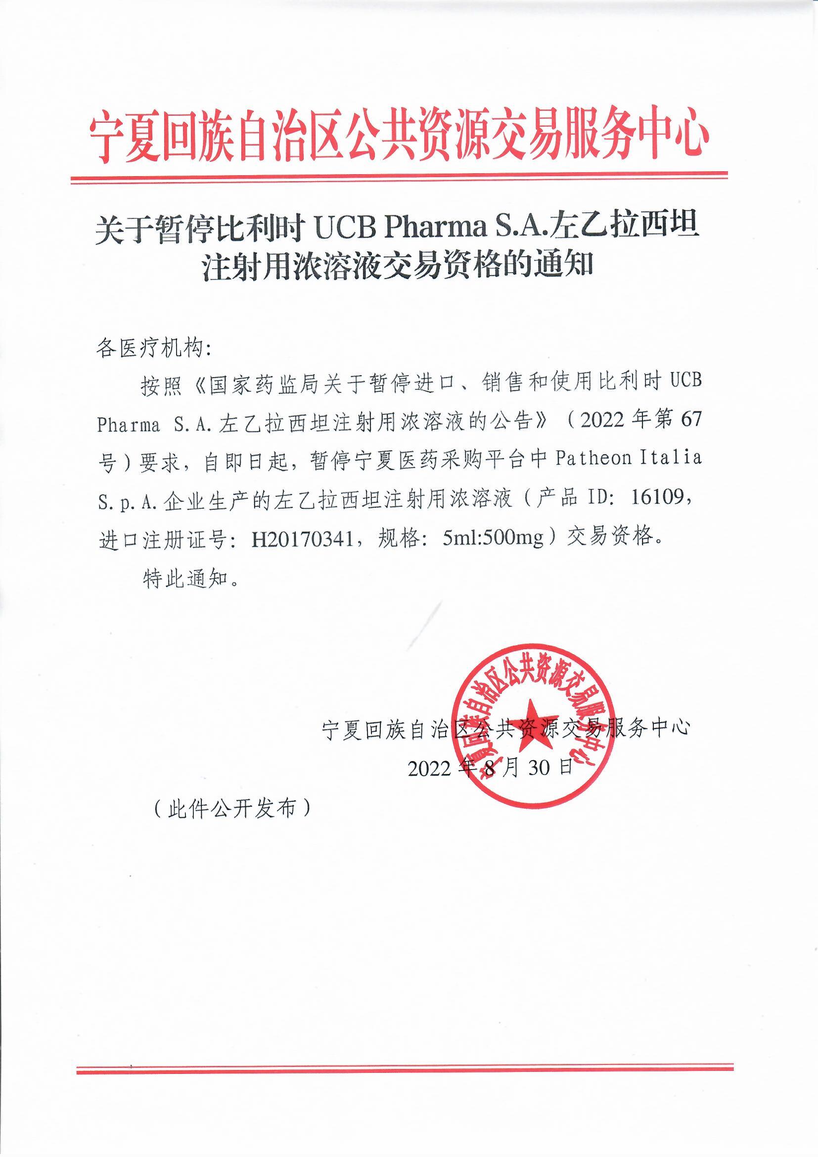【宁夏】宁夏回族自治区关于暂停比利时UCBPharmaS.A.左乙拉西坦注射用浓溶液交易资格的通知