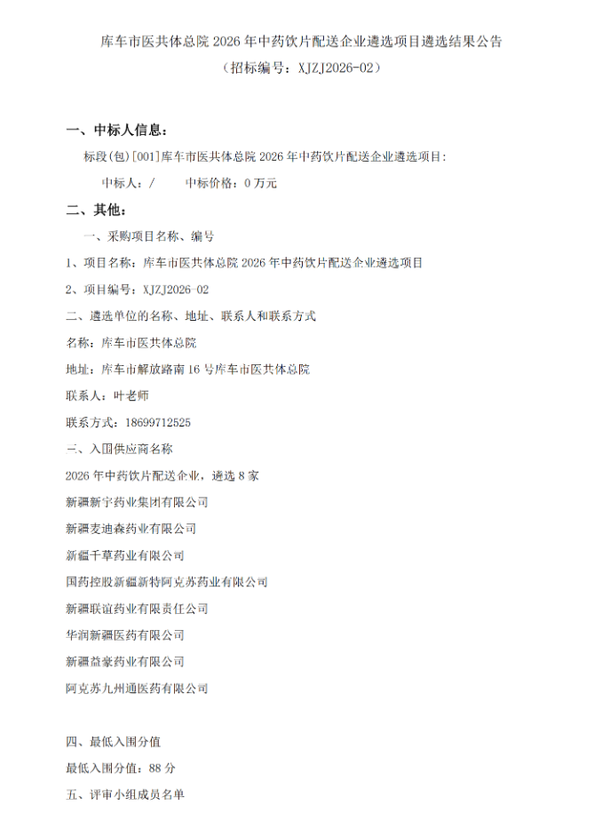 【阿克苏地区库车市医共体总院】新疆维吾尔自治区阿克苏地区库车市医共体总院2026年中药饮片配送企业遴选项目遴选结果公告