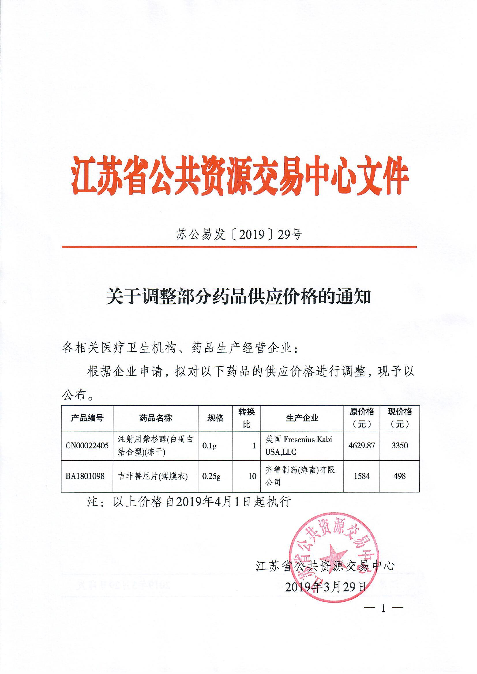 【江苏】江苏省关于调整部分药品供应价格的通知(20190329)