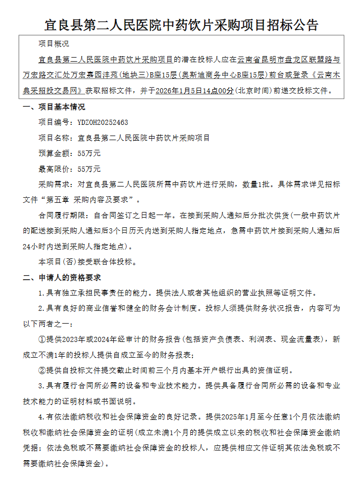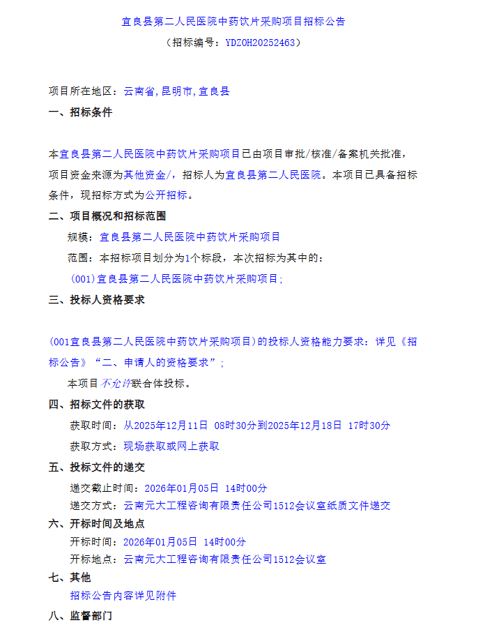 【昆明市宜良县第二人民医院】云南省昆明市宜良县第二人民医院中药饮片采购项目招标公告