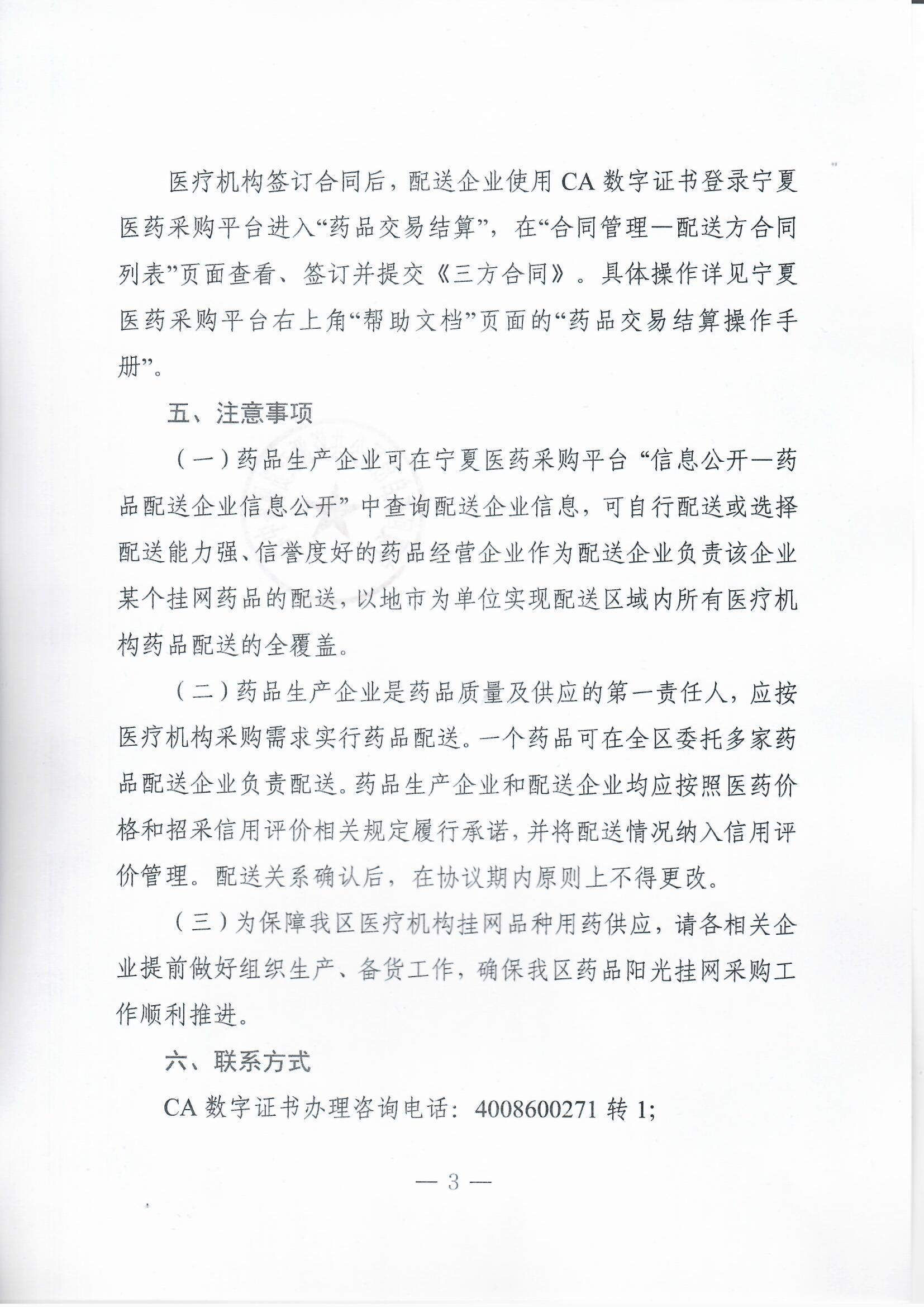 根据《宁夏回族自治区药品阳光挂网实施细则(试行)》(宁医保发〔2021〕182号)《自治区医保局 公共资源交易管理局关于印发宁夏回族自治区药品阳光挂网采购购销三方合同(范本)的通知》等文件要求,我中心即日起开展宁夏回族自治区药品阳光挂网配送关系维护及购销三方合同签订工作,具体事项通知如下: