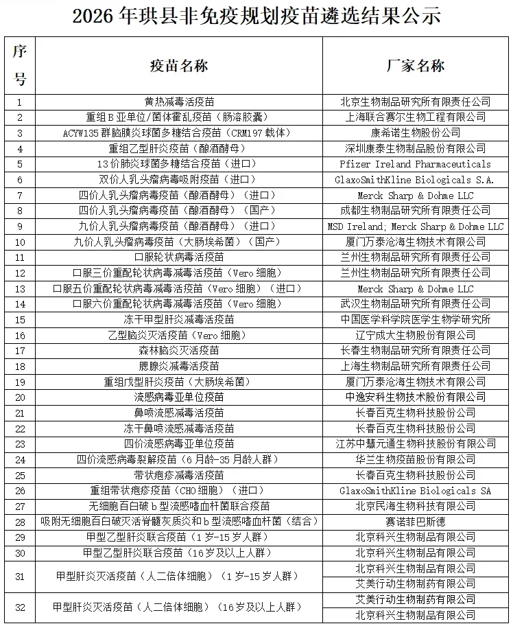 为贯彻落实《中华人民共和国疫苗管理法》,按照《珙县非免疫规划疫苗遴选采购评审实施方案》的要求,规范我县非免疫规划疫苗管理,保障预防接种工作安全、有序开展,同时做好廉政风险防范,加强监督管理,保证非免疫规划疫苗采购工作公正、公开、合理、有序地进行,我县在2026年1月30日客观公正的进行了非免疫规划疫苗遴选工作会,现将遴选结果予以公示(见附件)。公示日期自2026年1月30日至2026年2月5日。如有异议,请在公示期内进行申述。