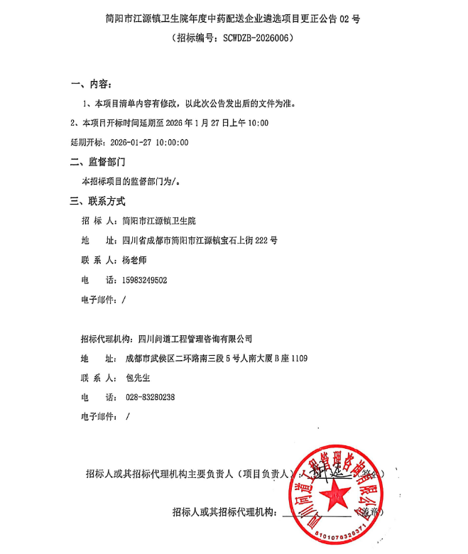 【成都市简阳市江源镇卫生院】四川省简阳市江源镇卫生院年度中药配送企业遴选项目更正公告02号