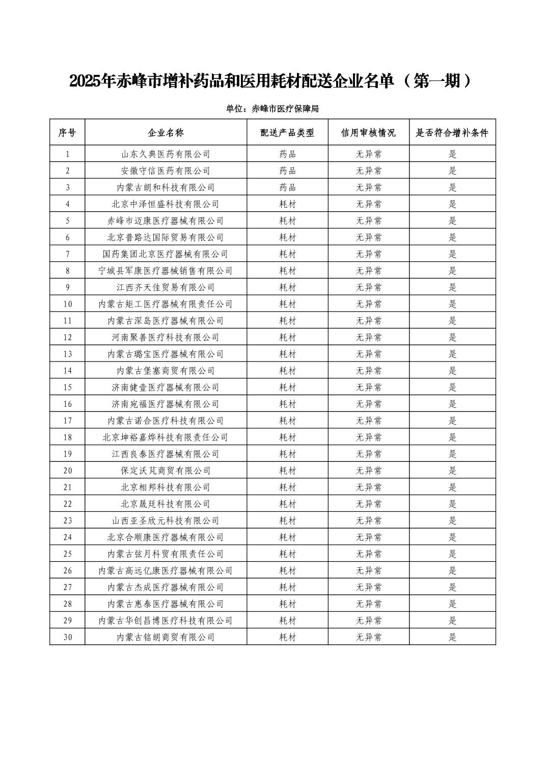 【赤峰】2025年赤峰市增补药品和医用耗材配送企业名单(第一期)