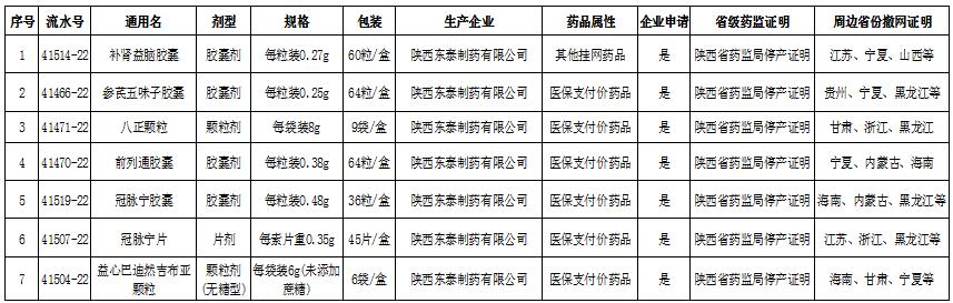 因国家政策调整、自然灾害、生产企业技术改造或其他不可抗力原因,导致企业暂时不能供应挂网交易药品的情况,依据省医保局价采工作联席会议决议,可根据相关企业申请、该企业所属地省级药监部门出具的停产证明和周边至少3个省份(自治区、直辖市)药品交易平台撤网证明 ,对相关药品予以暂停交易处理。撤网后,企业原履行的义务和责任不变,该企业生产的同品种、同给药途径的所有规格及包装药品不得再次申请挂网。现依据上述要求对相关企业申请的相关药品暂停网上交易资格(见下表),请相关医疗机构及时调整药品采购目录。