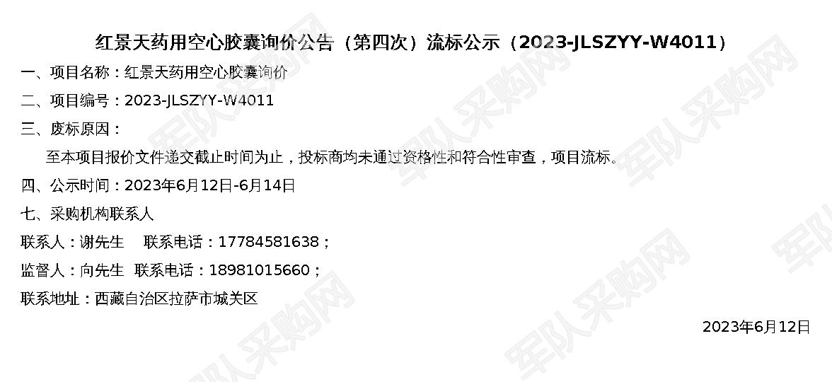 【军队采购】军队采购网红景天药用空心胶囊询价公告(第四次)流标公示(2023-JLSZYY-W4011)