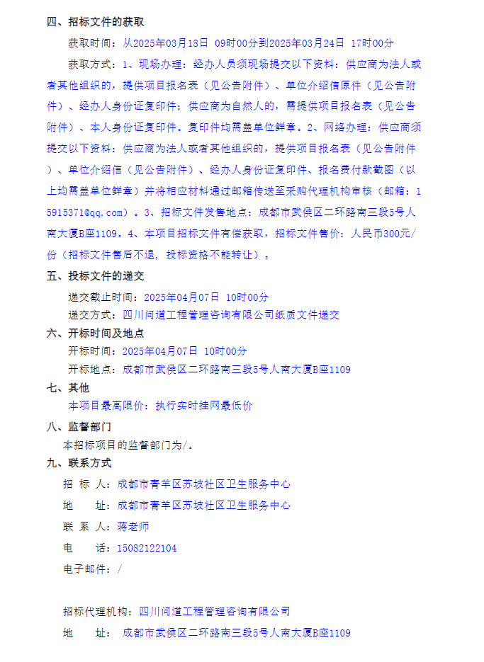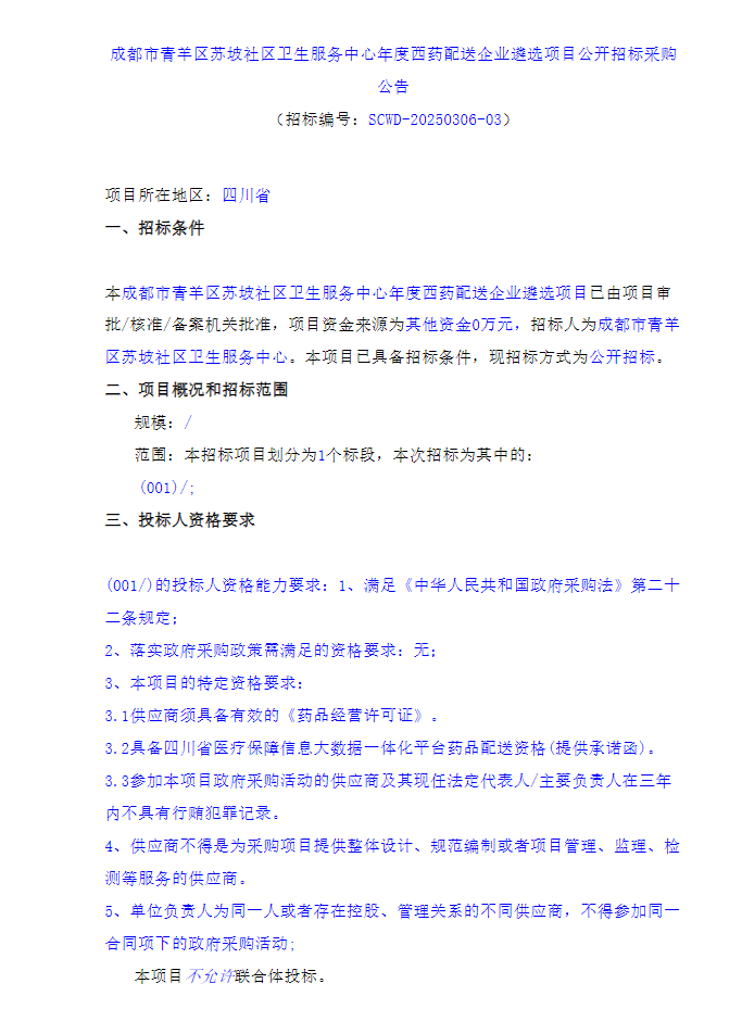 【成都市青羊区苏坡社区卫生服务中心】四川省成都市青羊区苏坡社区卫生服务中心年度西药配送企业遴选项目公开招标采购公告