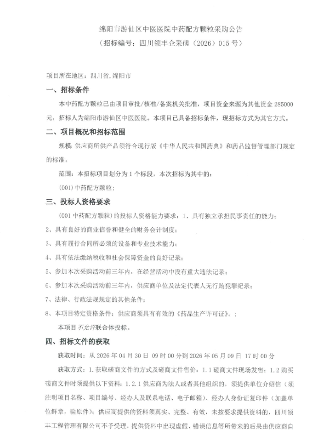 【绵阳市游仙区中医医院】四川省绵阳市游仙区中医医院中药配方颗粒采购公告