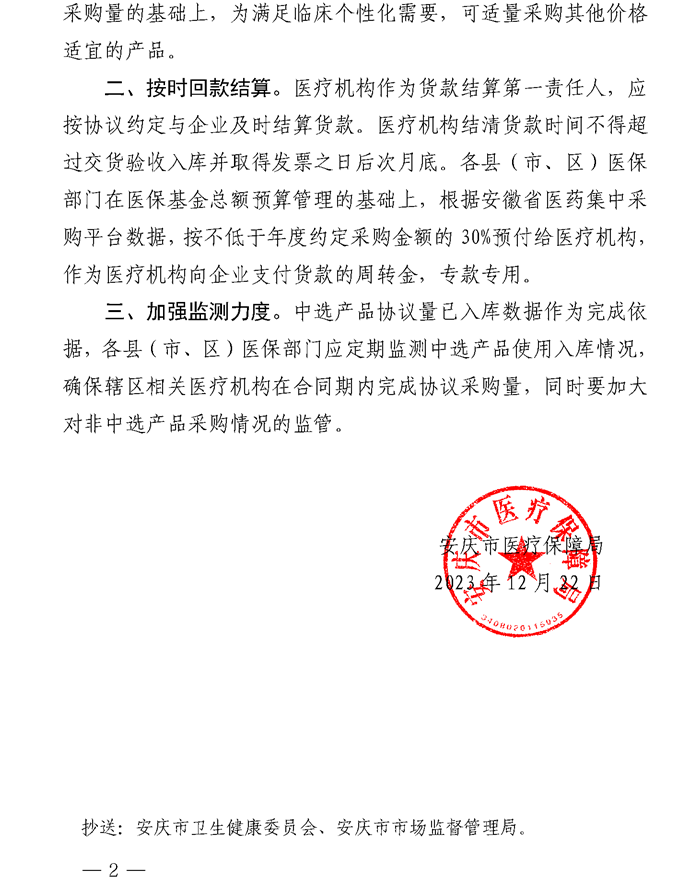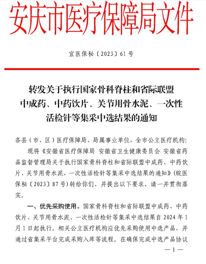 【安庆】转发关于执行国家骨科脊柱和省际联盟中成药、中药饮片、关节用骨水泥、一次性活检针等集采中选结果的通知宜医保秘〔2023〕61 号