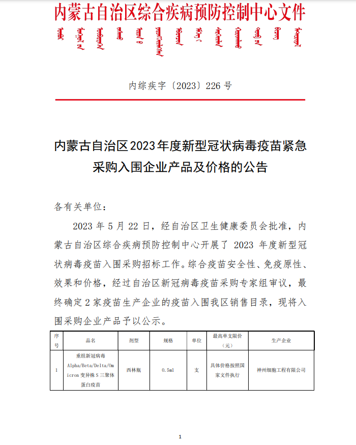 2023年5月22日,经自治区卫生健康委员会批准,内蒙古自治区综合疾病预防控制中心开展了2023年度新型冠状病毒疫苗入围采购招标工作。综合疫苗安全性、免疫原性、效果和价格,经过自治区新冠病毒疫苗采购专家组审议,最终确定2家疫苗生产企业的疫苗入围我区销售目录,现将入围采购企业产品予以公示。
