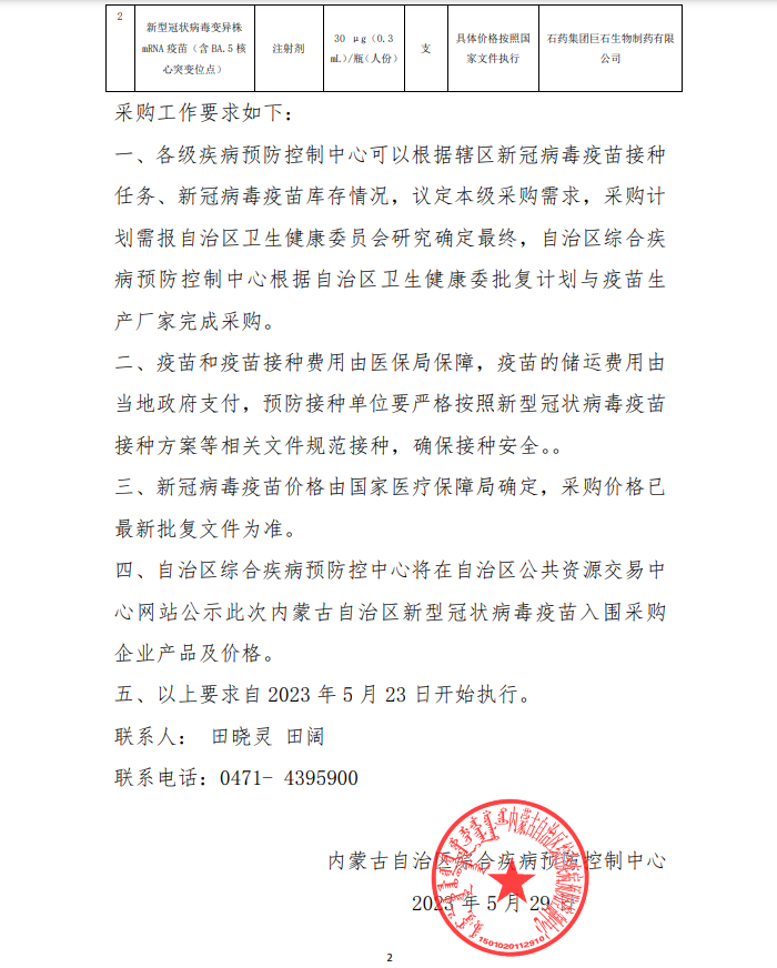 四、自治区综合疾病预防控中心将在自治区公共资源交易中心网站公示此次内蒙古自治区新型冠状病毒疫苗入围采购企业产品及价格。五、以上要求自2023年5月23日开始执行。