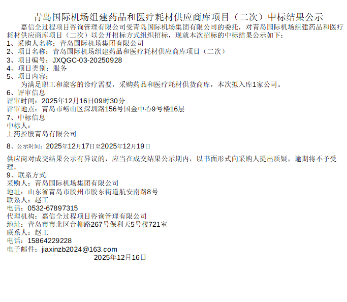 【青岛国际机场集团有限公司】山东省青岛国际机场组建药品和医疗耗材供应商库项目(二次)中标结果公示