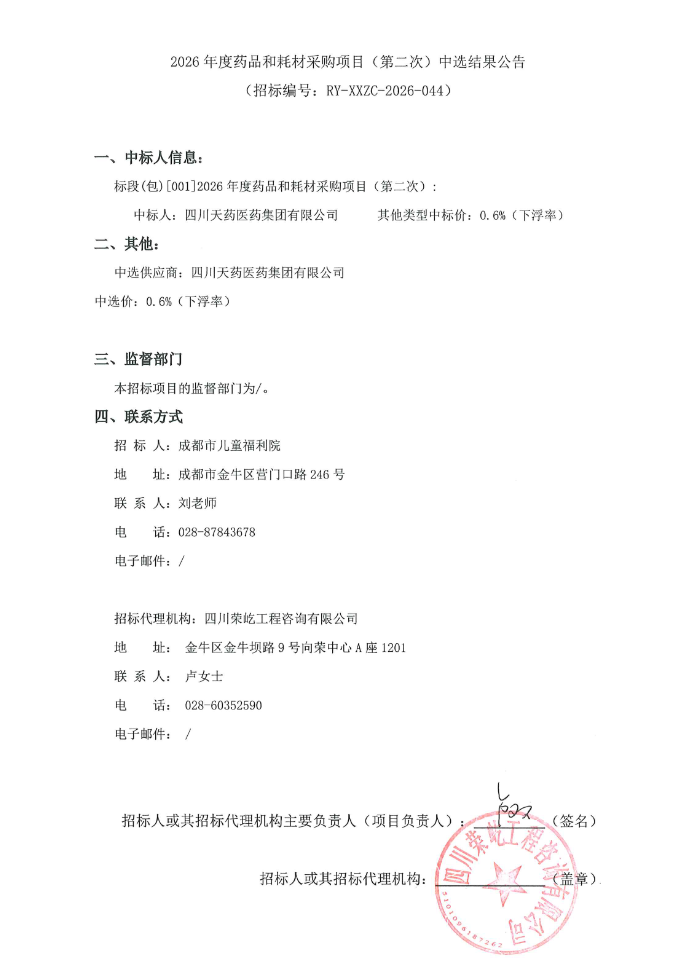 【成都市儿童福利院】四川省成都市儿童福利院2026年度药品和耗材采购项目(第二次)中选结果公告