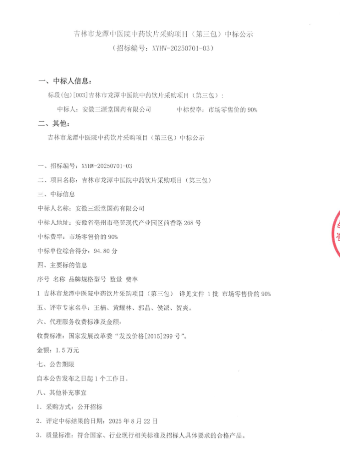 【吉林市龙潭中医院】吉林省吉林市龙潭中医院中药饮片采购项目(第三包)中标公示