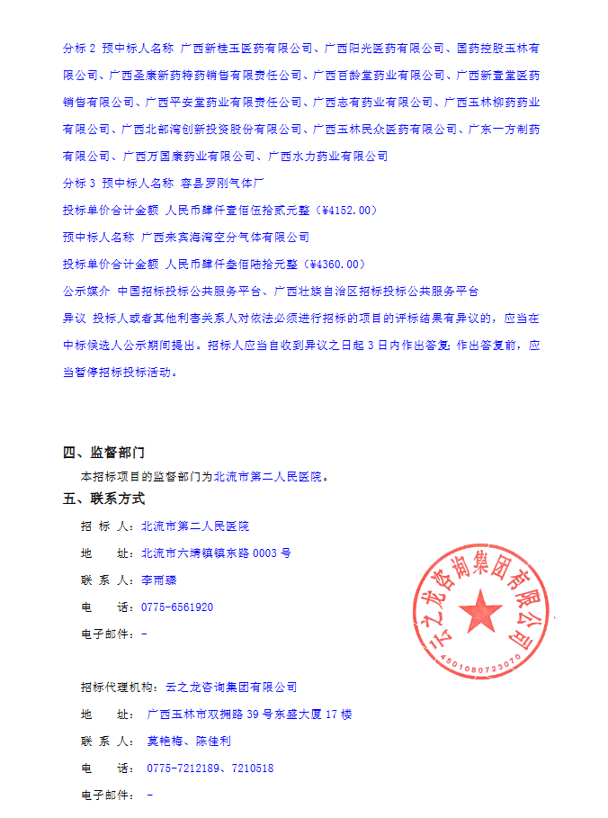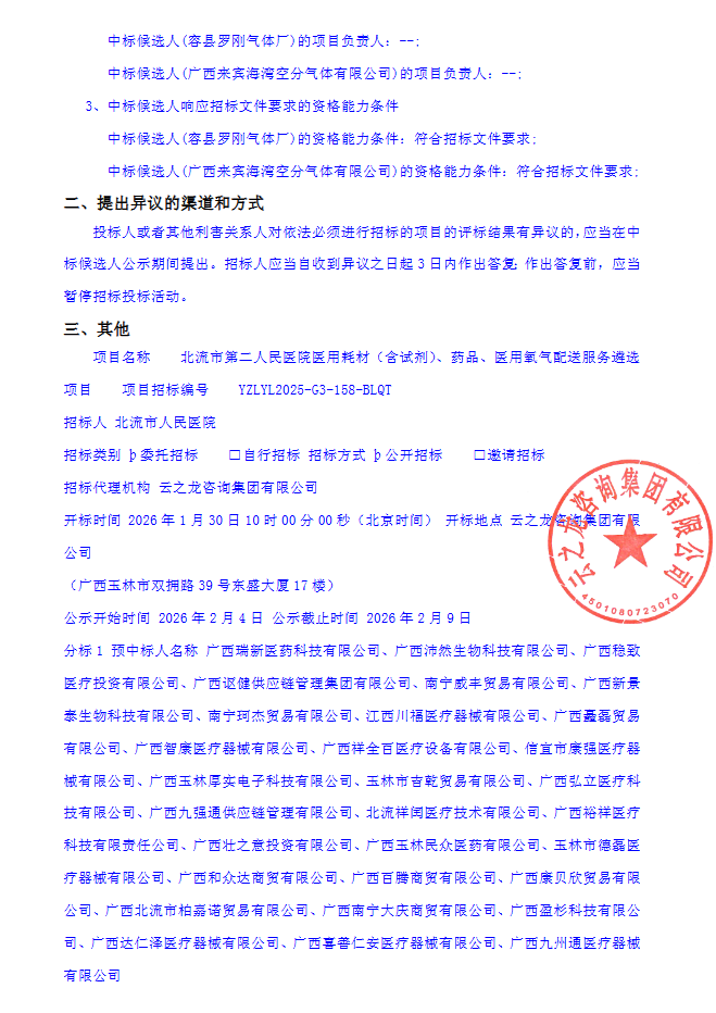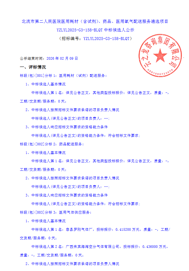 【玉林市北流市第二人民医院】广西壮族自治区北流市第二人民医院医用耗材(含试剂)、药品、医用氧气配送服务遴选项目YZLYL2025-G3-158-BLQT中标候选人公示