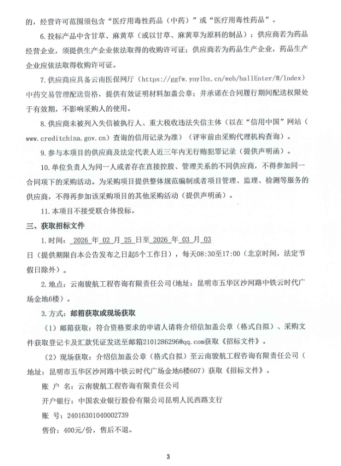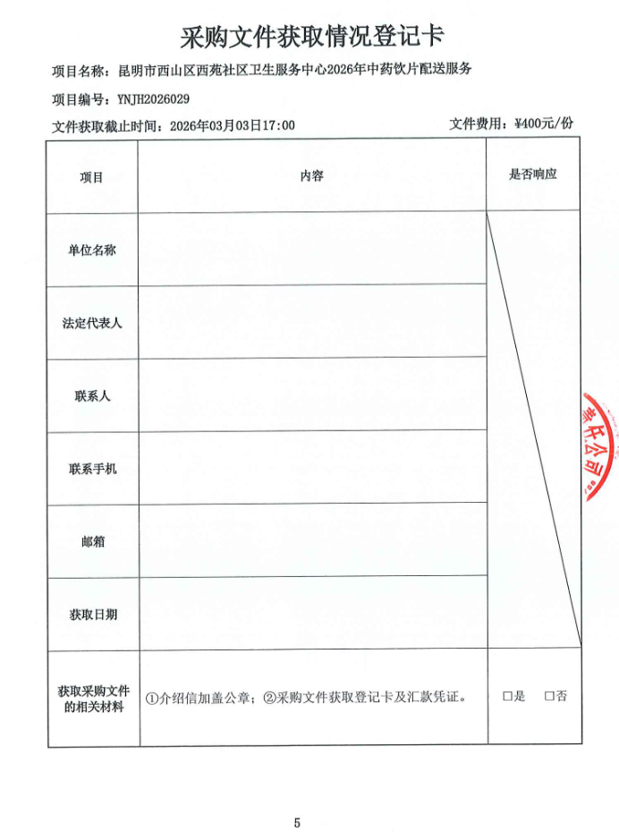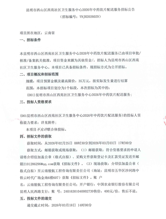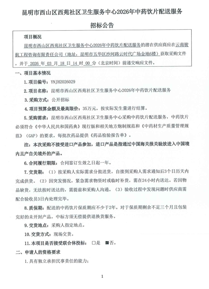 【昆明市西山区西苑社区卫生服务中心】云南省昆明市西山区西苑社区卫生服务中心2026年中药饮片配送服务招标公告