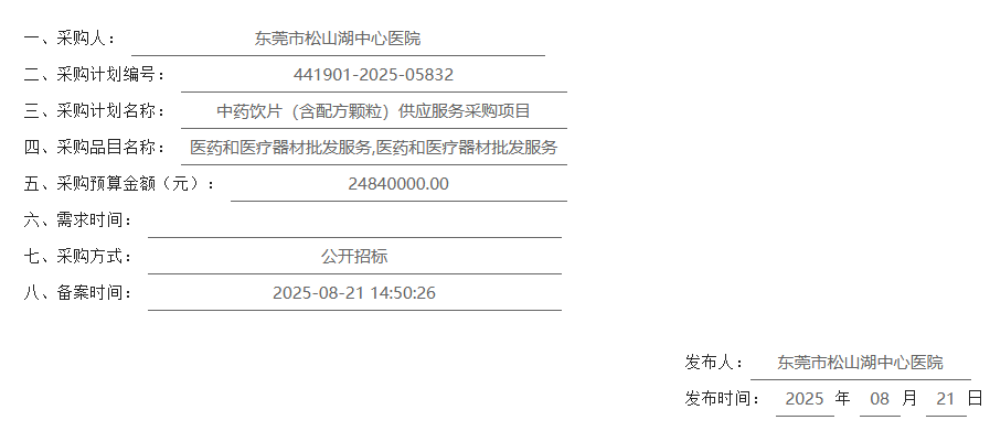 【东莞市松山湖中心医院】广东省东莞市松山湖中心医院中药饮片(含配方颗粒)供应服务采购项目