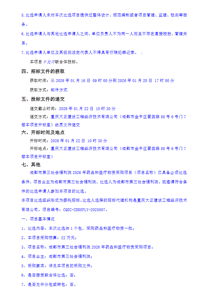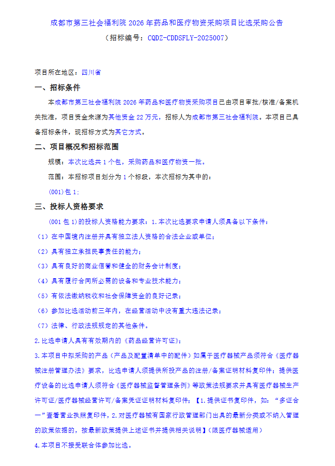 【成都市第三社会福利院】四川省成都市第三社会福利院2026年药品和医疗物资采购项目比选采购公告