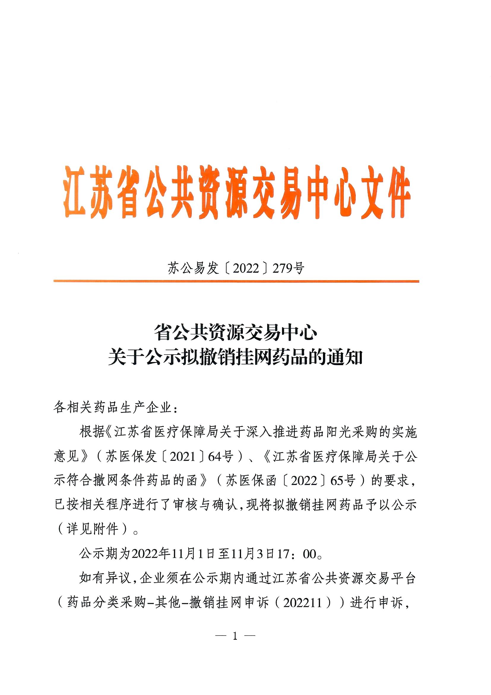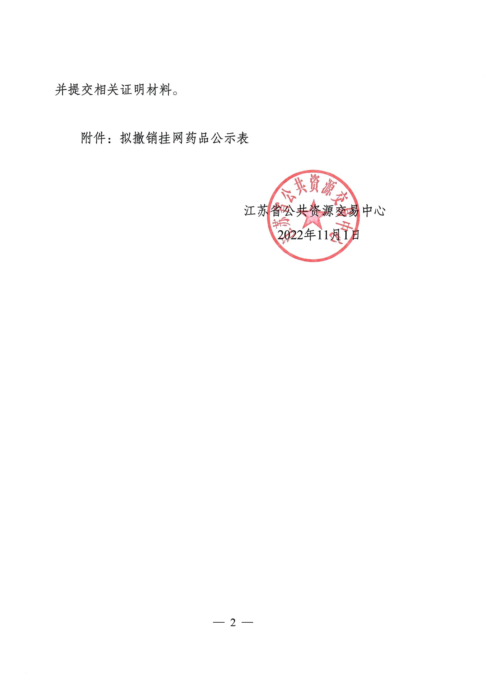 【江苏】省公共资源交易中心关于公示拟撤销挂网药品的通知