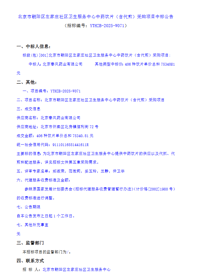 【北京市朝阳区左家庄社区卫生服务中心】北京市朝阳区左家庄社区卫生服务中心中药饮片(含代煎)采购项目中标公告