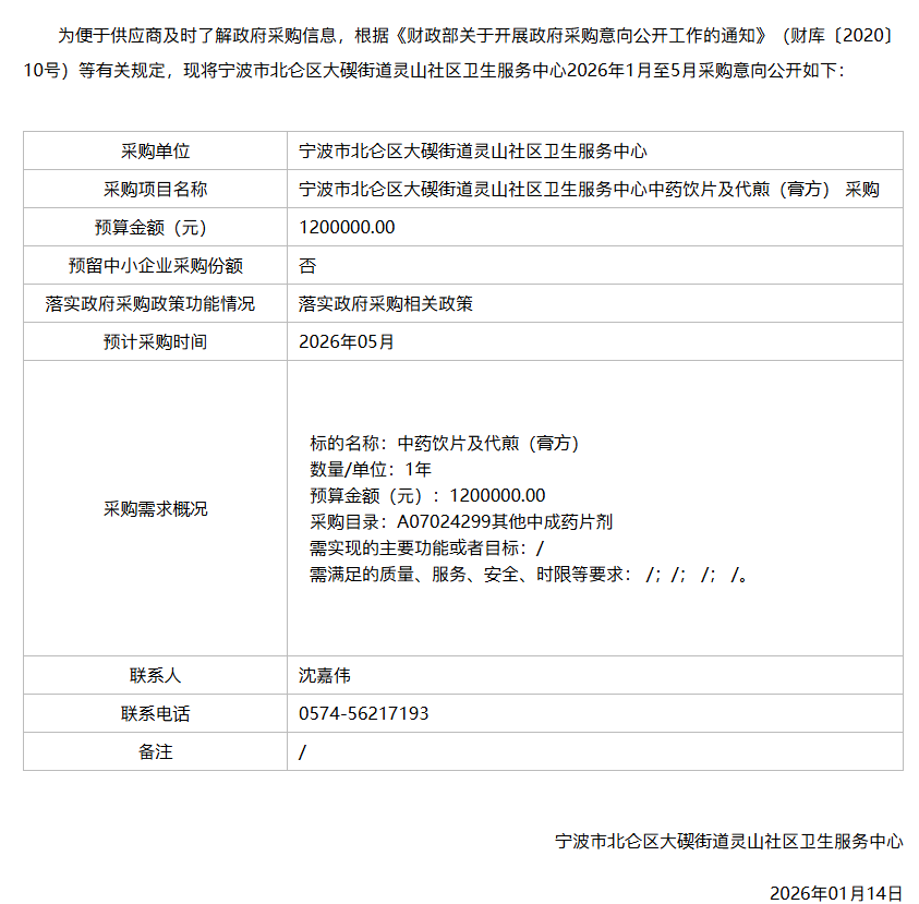 【宁波市北仑区大碶街道灵山社区卫生服务中心】浙江省宁波市北仑区大碶街道灵山社区卫生服务中心2026年1月至5月政府采购意向1