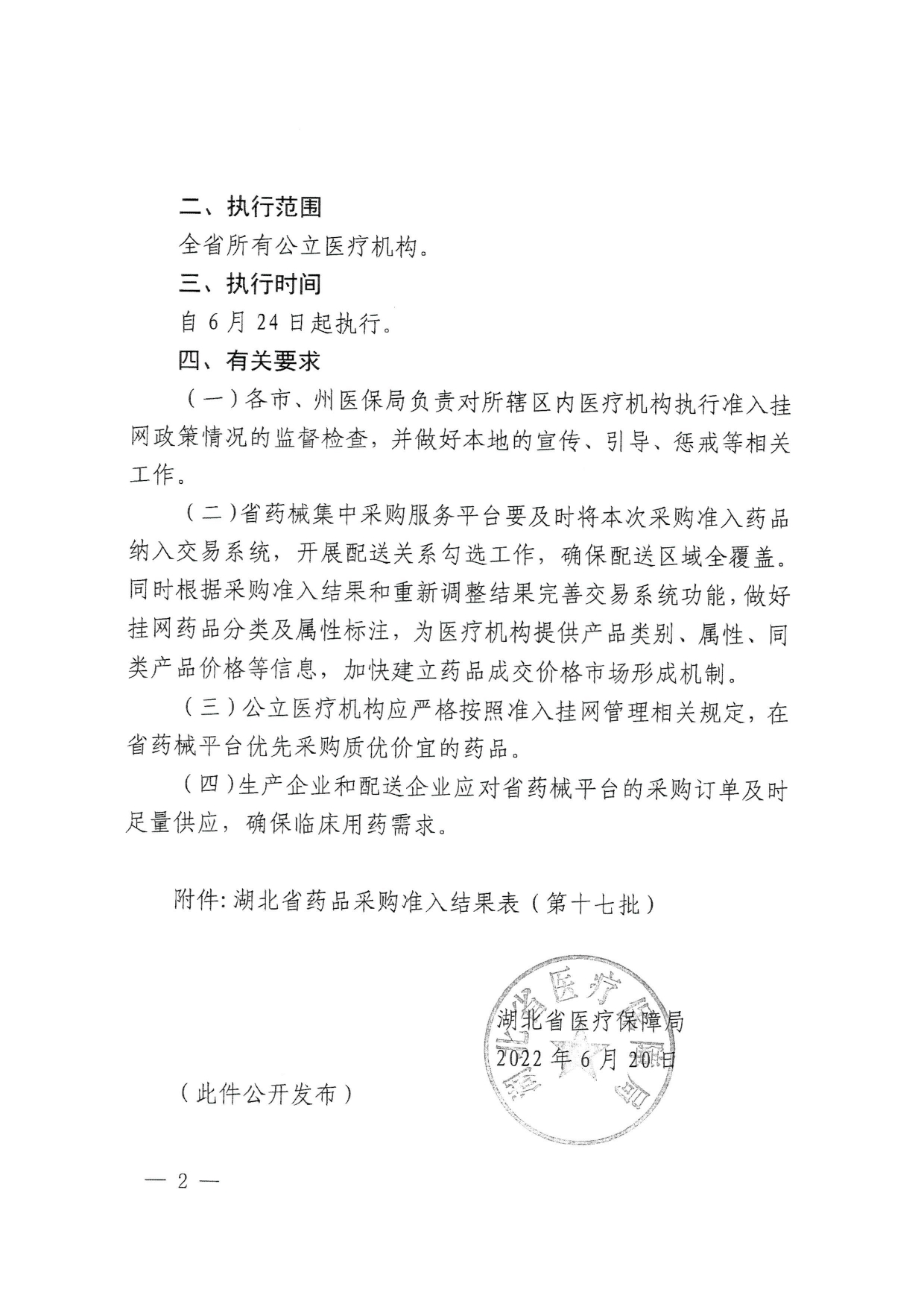 现将《省医疗保障局关于执行湖北省药品采购准入结果(第十七批)的通知》(鄂医保发〔2022〕42号)转发给你们,请遵照执行。