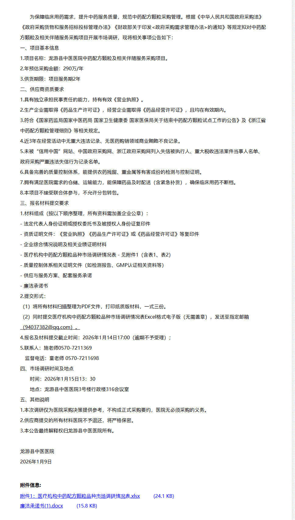 【衢州市龙游县中医医院】浙江省衢州市龙游县中医医院关于龙游县中医医院中药配方颗粒及相关伴随服务采购项目的调研公告