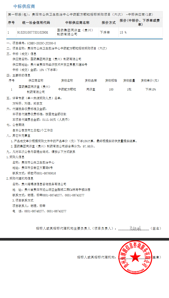 【贵阳市公共卫生救治中心】贵州省贵阳市公共卫生救治中心中药配方颗粒招标采购项目(六次)成交公告
