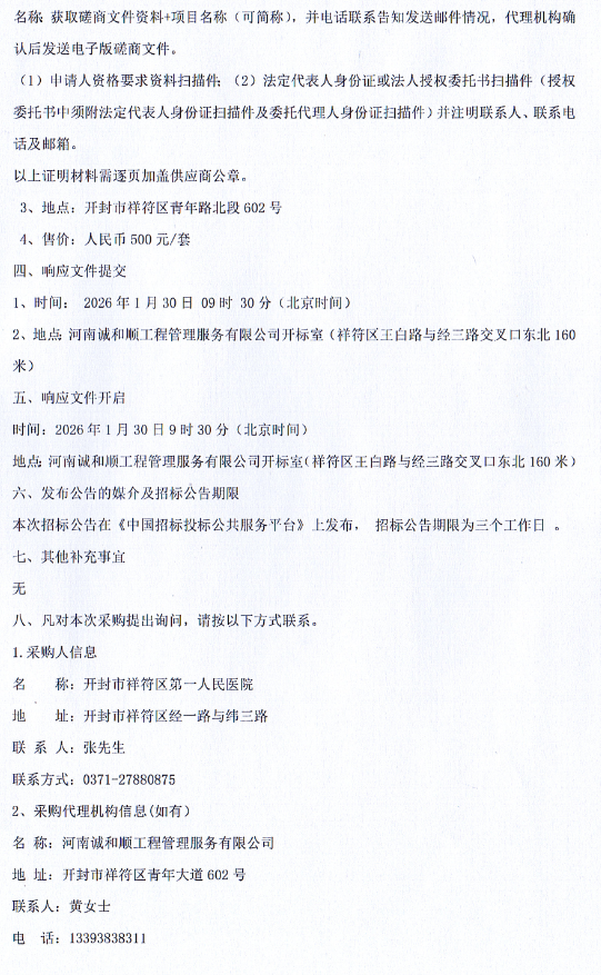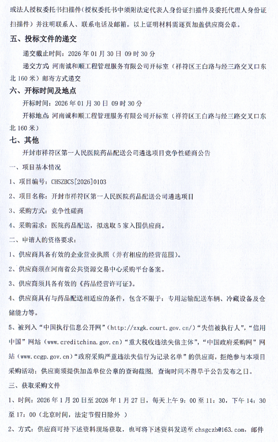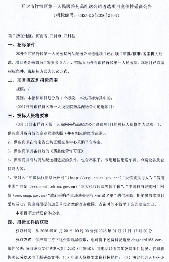 【开封市祥符区第一人民医院】河南省开封市祥符区第一人民医院药品配送公司遴选项目竞争性磋商公告