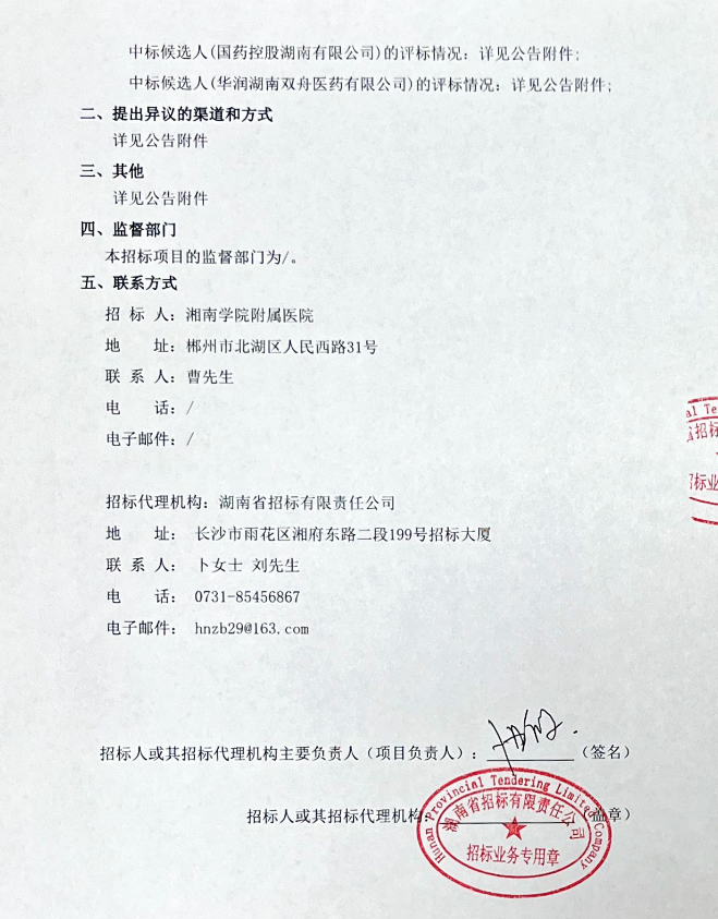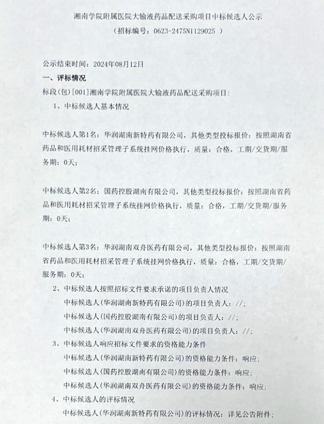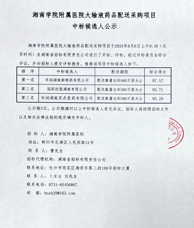 【郴州市湘南学院附属医院】湖南省湘南学院附属医院大输液药品配送采购项目中标候选人公示