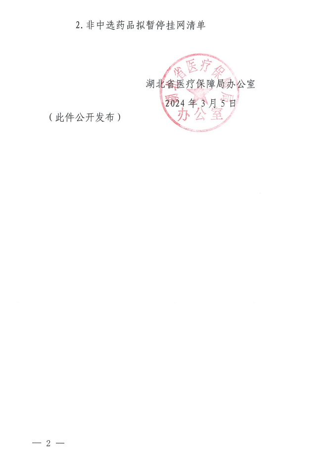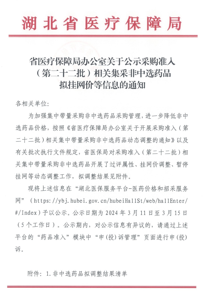 【湖北】省医疗保障局办公室关于公示采购准入(第二十二批)相关集采非中选药品拟挂网价等信息的通知
