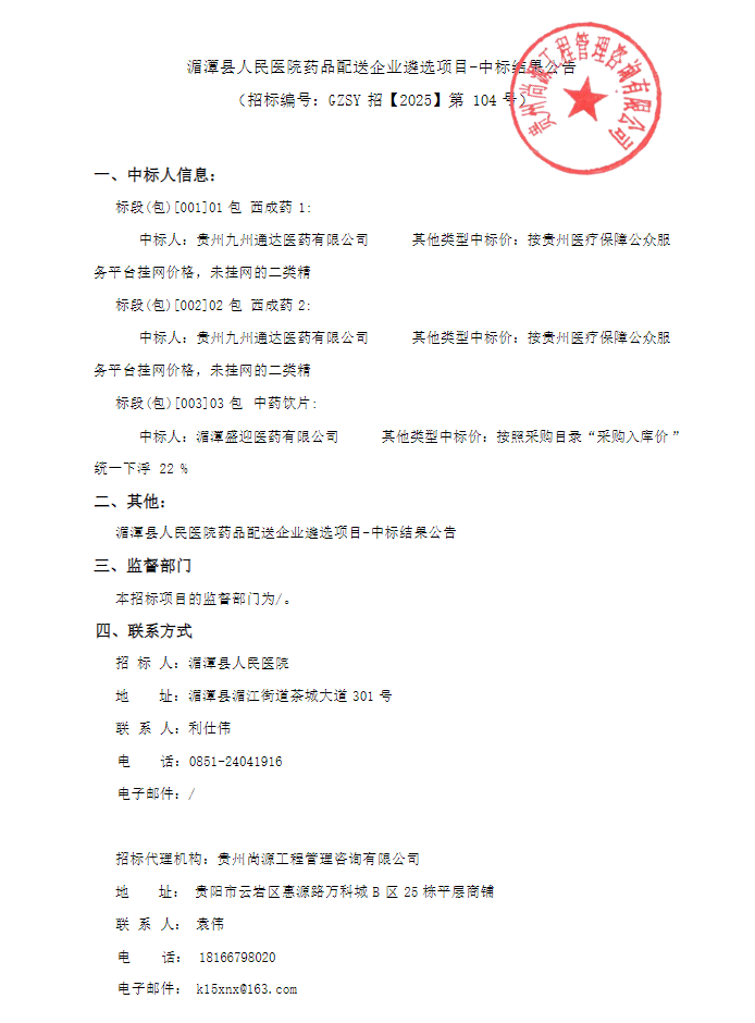 【遵义市湄潭县人民医院】贵州省遵义市湄潭县人民医院药品配送企业遴选项目-中标结果公告