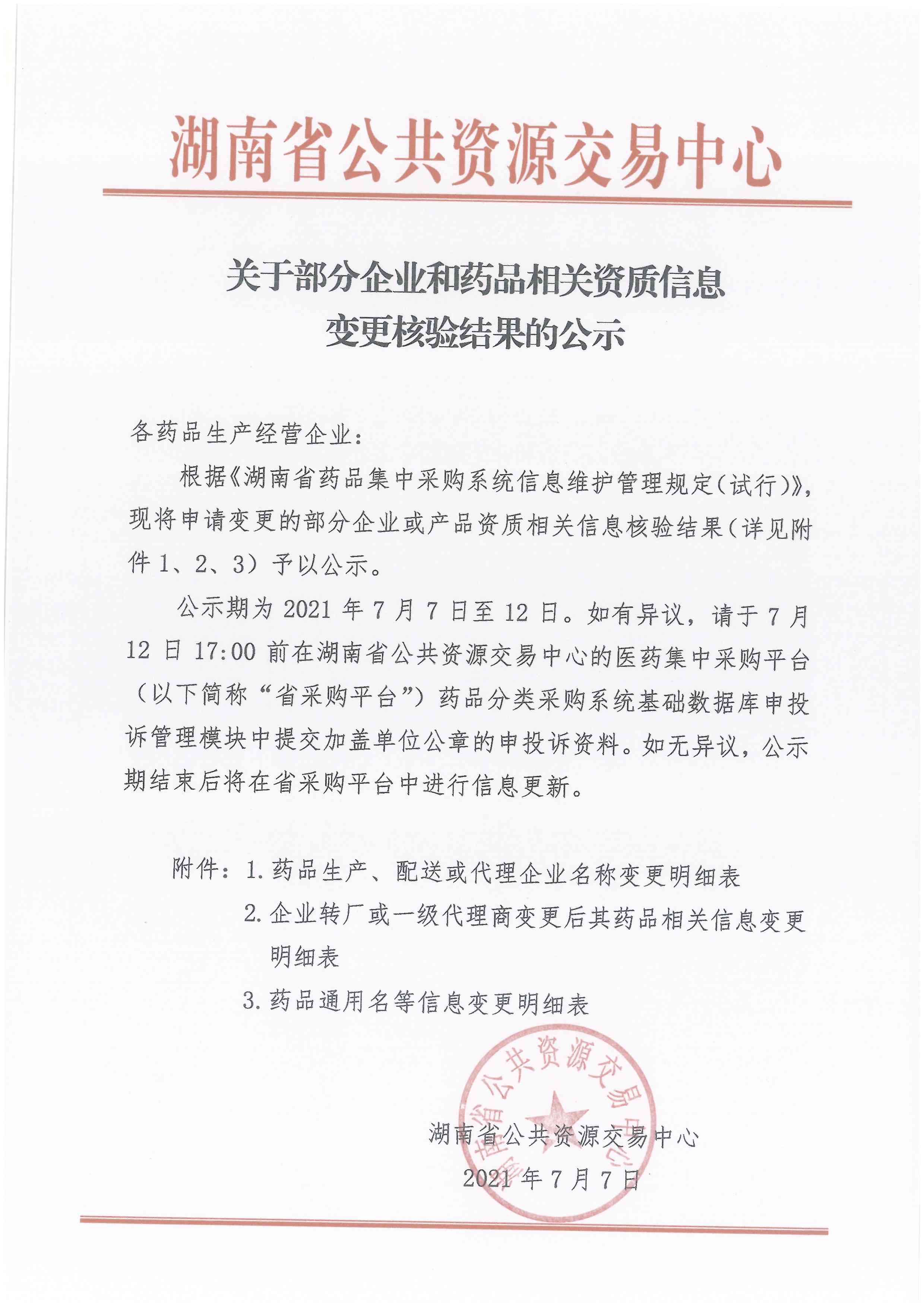 【湖南】2021年湖南省关于部分企业和药品相关资质信息变更核验结果的公示